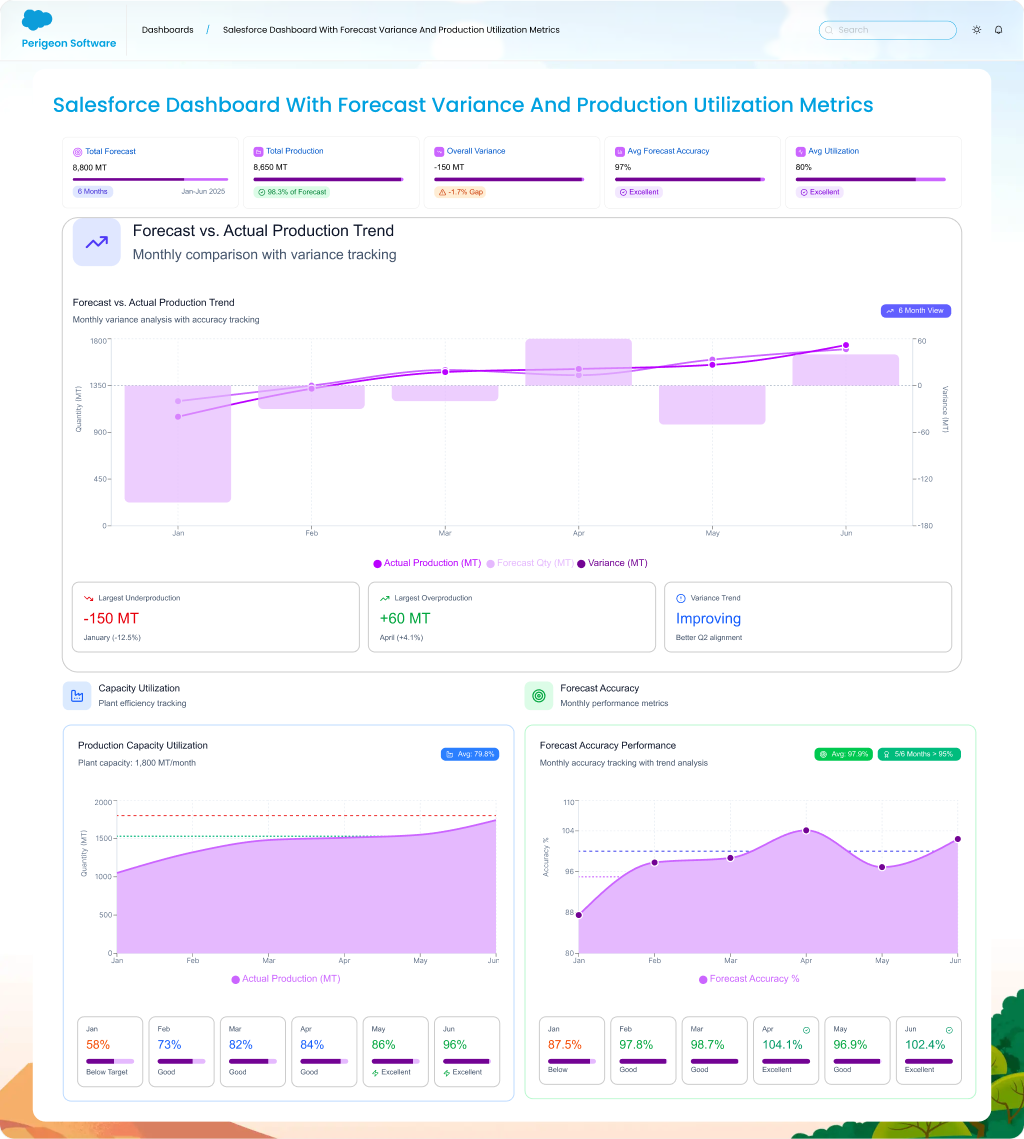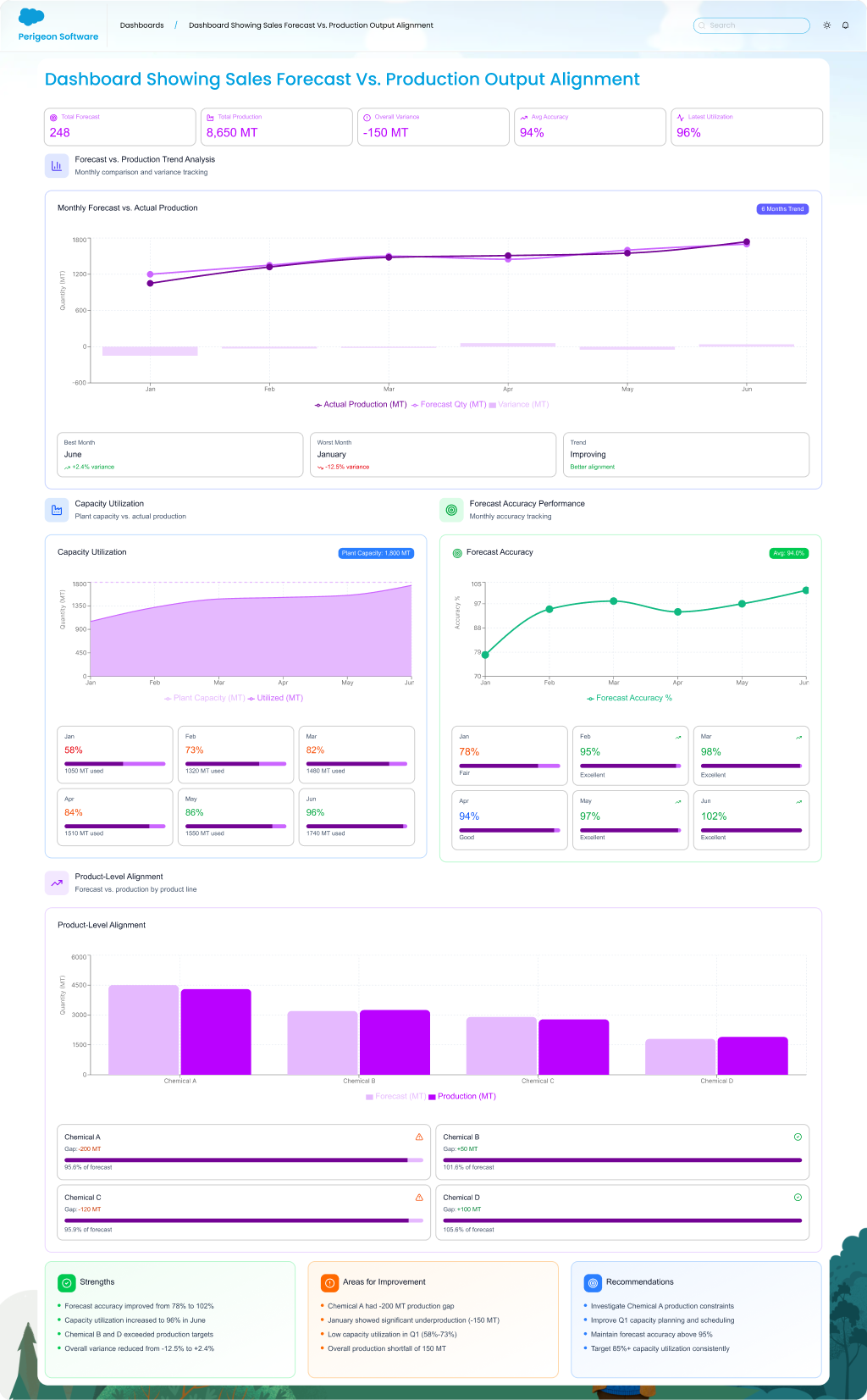 Salesforce connects forecasts directly to production metrics. When sales teams update projections or customers modify orders, production plans automatically adjust.