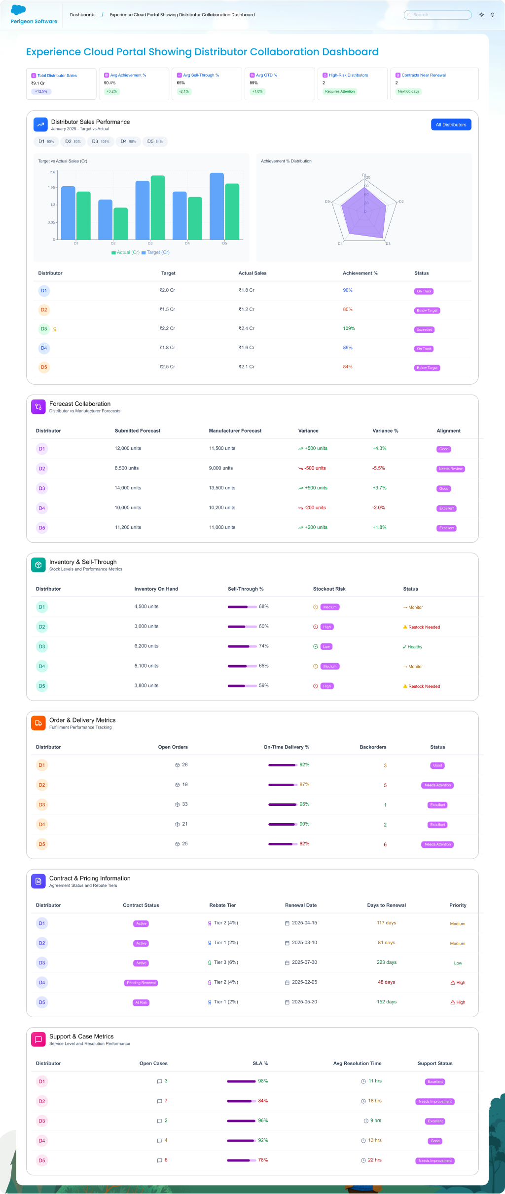 Through Salesforce Experience Cloud, manufacturers can share forecast data, production schedules, and order updates with distributors and suppliers securely.