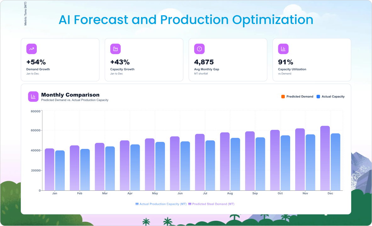 AI Forecast and Production Optimization: Chart showing predicted steel demand vs. actual production capacity.
