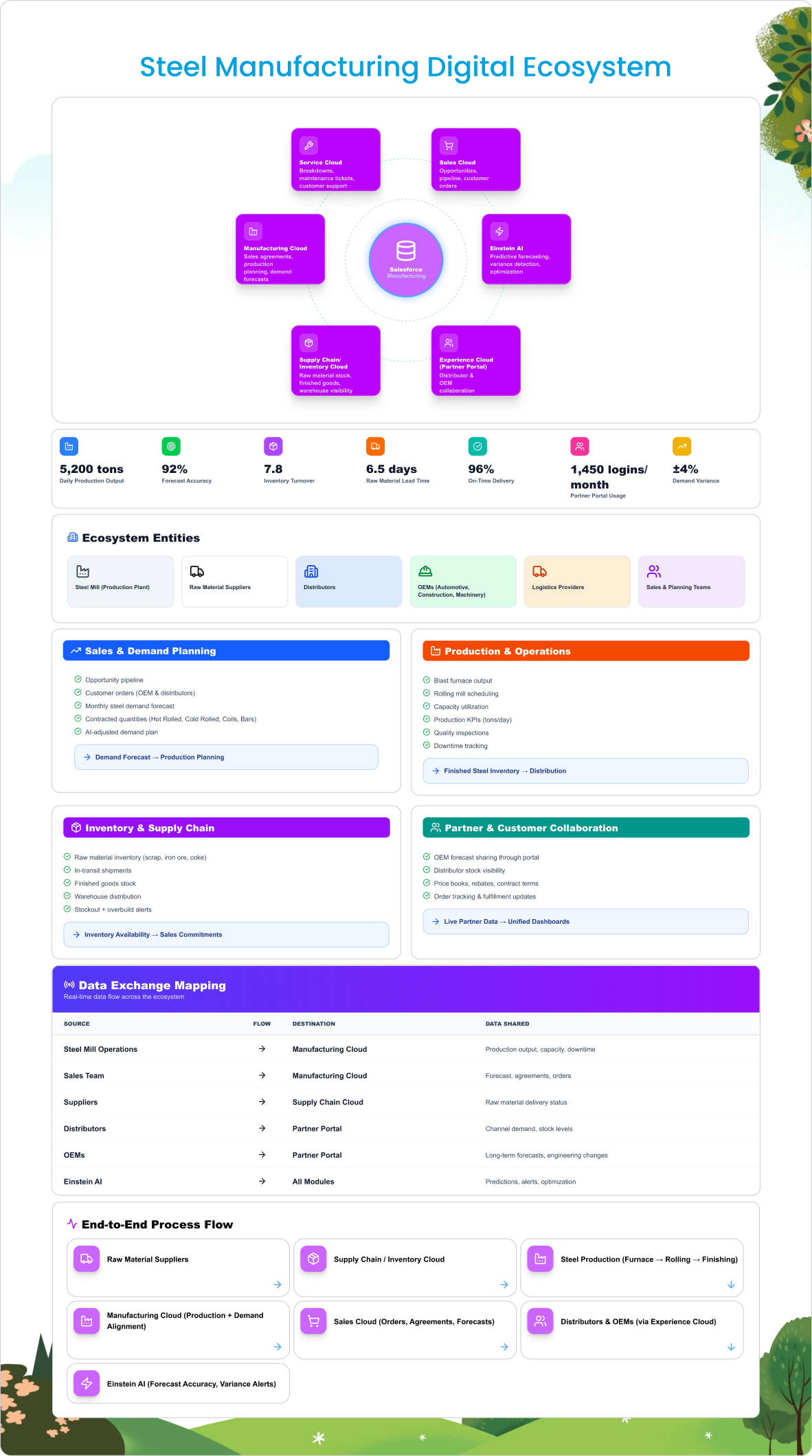 Steel Manufacturing Digital Ecosystem: A visual showing steel production, sales, and forecasting connected through Salesforce cloud modules.