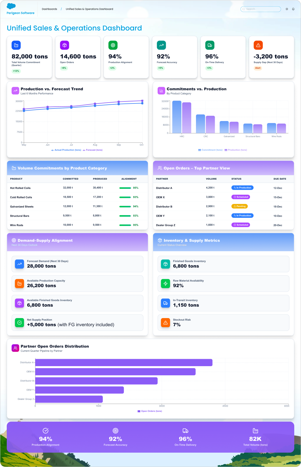 Unified Sales & Operations Dashboard: Salesforce dashboard showing volume commitments, open orders, and production alignment.