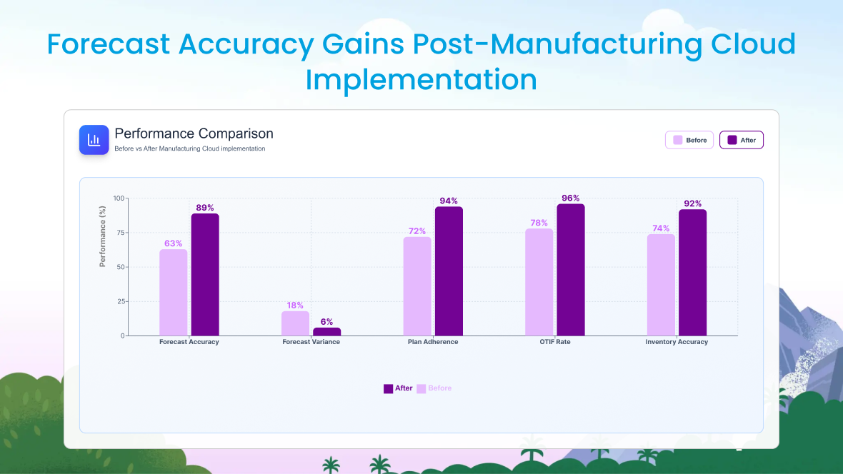 Forecast Accuracy Gains Post-Manufacturing Cloud Implementation Bar chart comparing pre- and post-Salesforce implementation metrics.