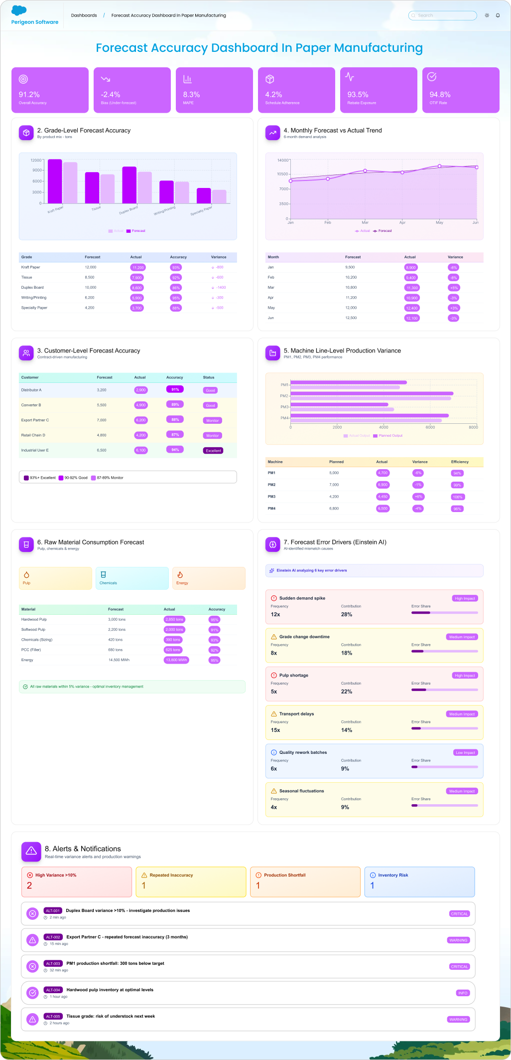 Forecast Accuracy Dashboard in Paper ManufacturingA Salesforce dashboard showing forecast vs. actual demand by paper grade, with trend lines and confidence intervals.