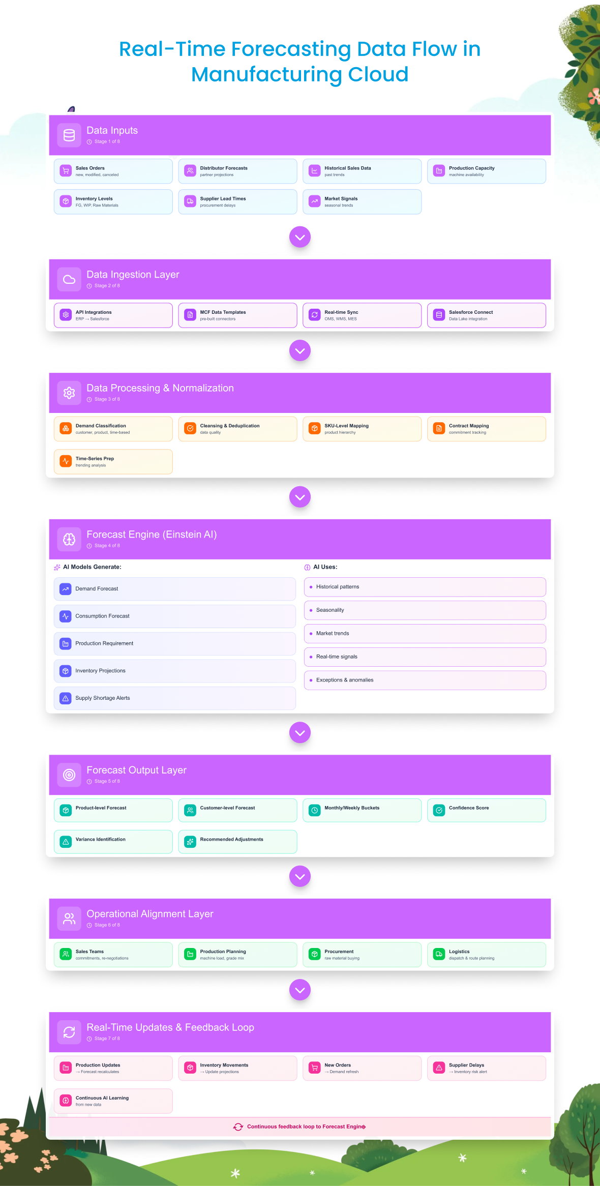 Real-Time Forecasting Data Flow in Manufacturing CloudDiagram showing live data integration between sales, ERP, and production.
