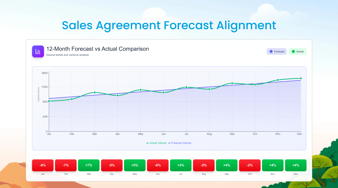 Sales Agreement Forecast AlignmentVisual comparing forecast vs. actual order volumes under a long-term customer contract.