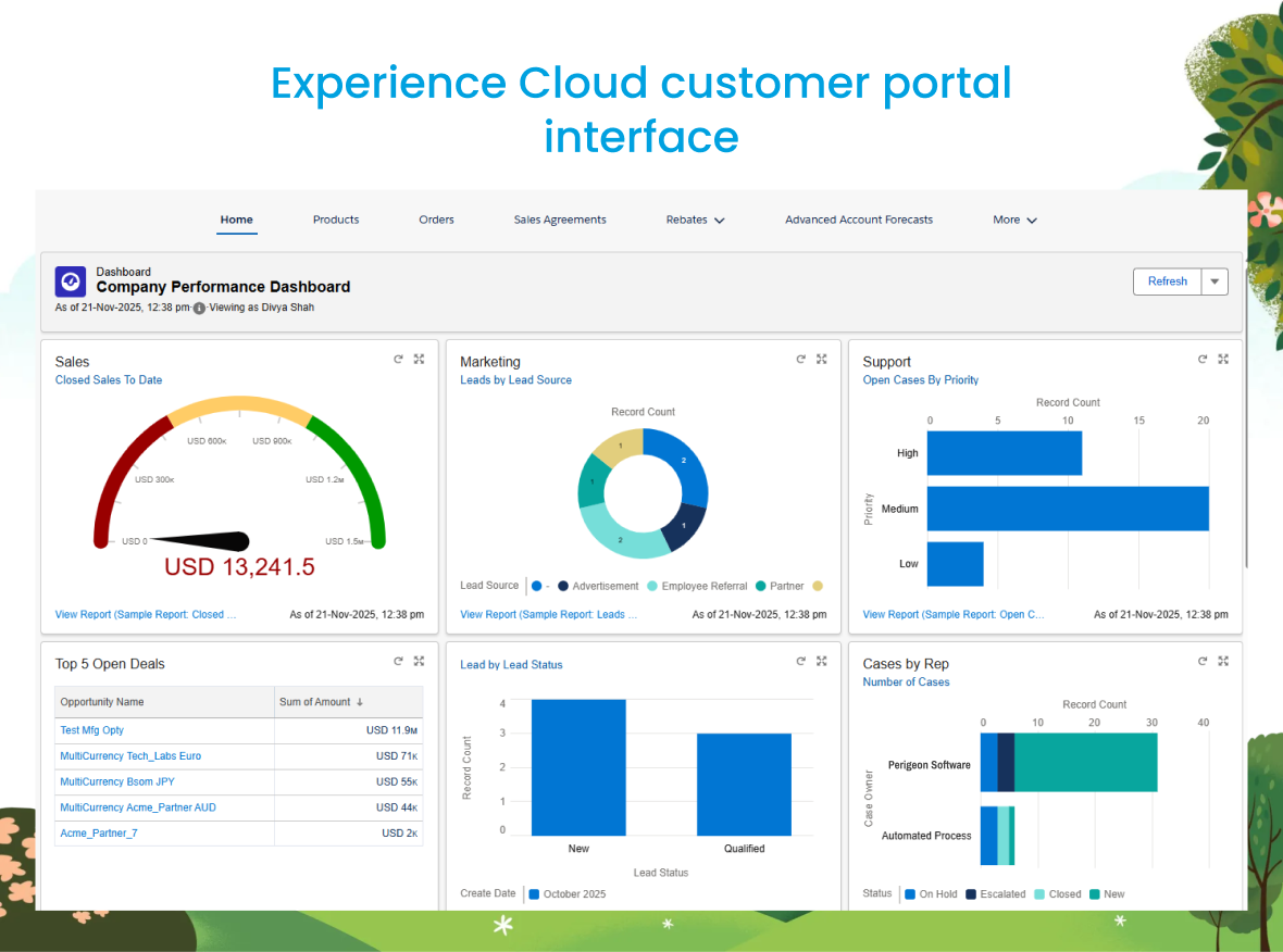 Salesforce Experience Cloud extends Manufacturing Cloud’s capabilities to customer-facing portals — giving clients secure, 24/7 access to: