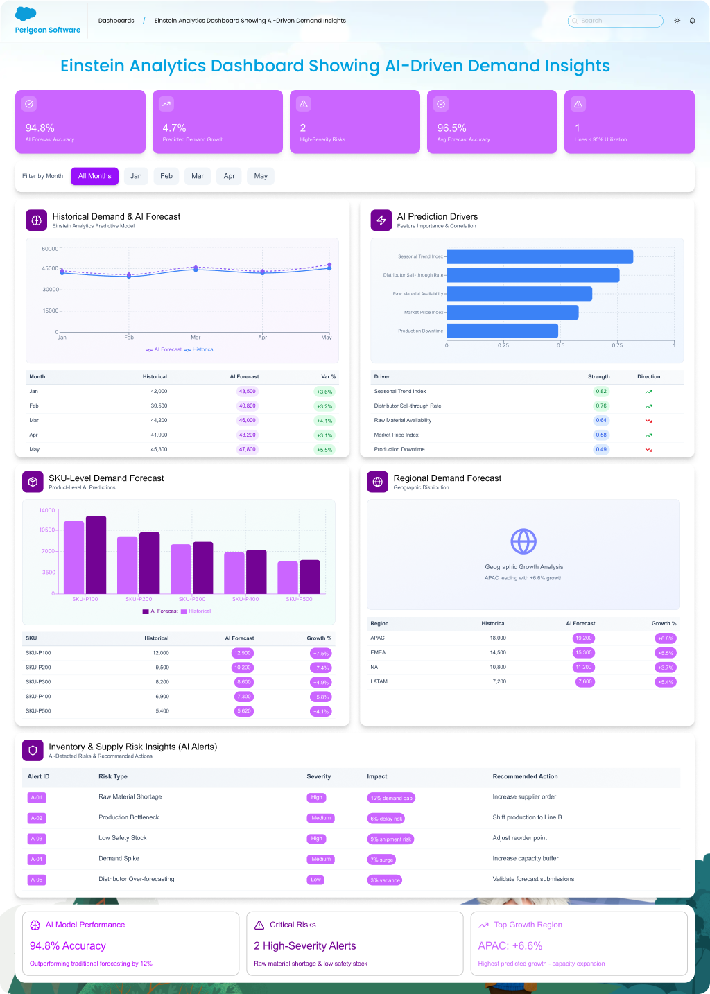 With Salesforce Einstein AI, manufacturers can predict demand shifts by analyzing historical sales, seasonal patterns, and market signals.