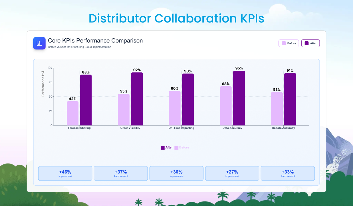 AreaImprovementForecast Accuracy+35%Rebate Management-60% admin timeOrder Visibility+45% faster status trackingDistributor Retention+20% increaseOperational Cost-15% reduction