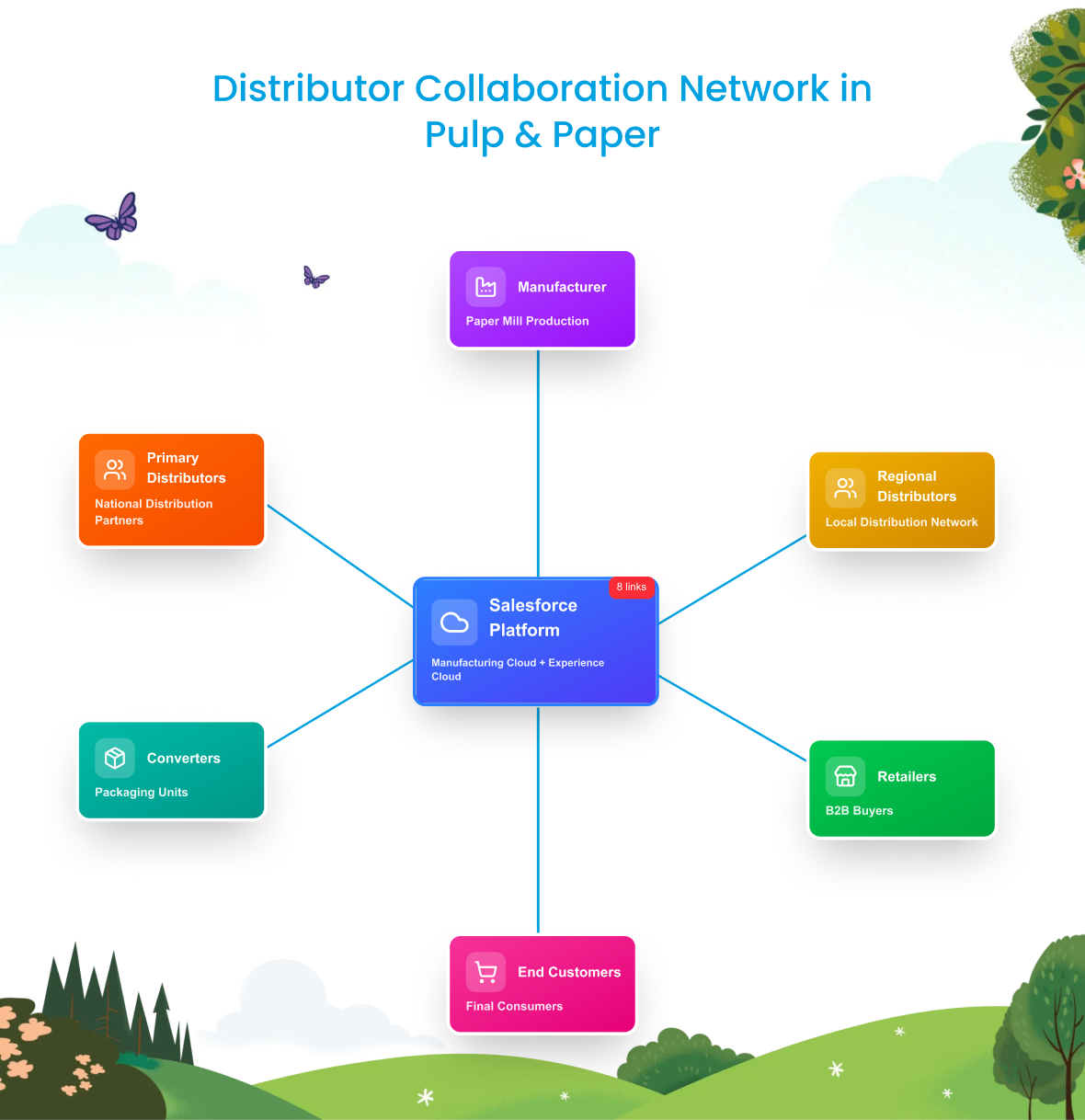Distributor Collaboration Network in Pulp & PaperA visual map showing how Salesforce connects manufacturers, distributors, and end customers in one ecosystem.