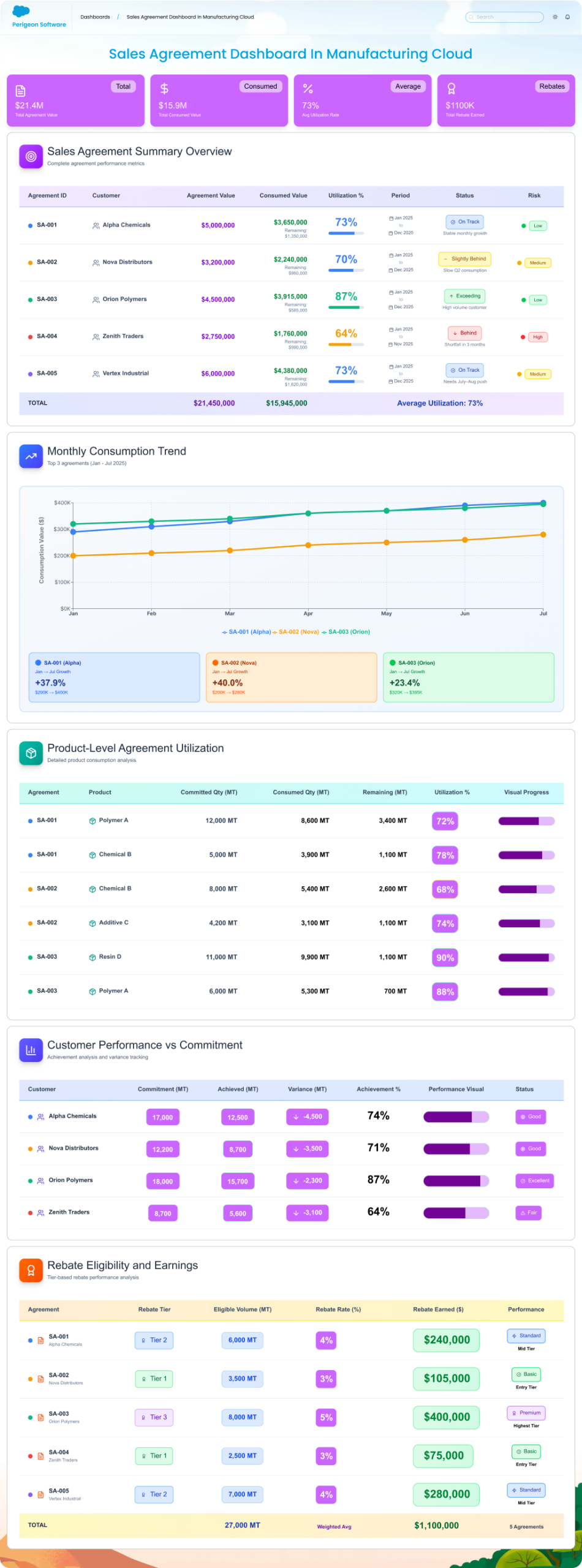 - Automated quarterly rebate tracking and performance dashboards.