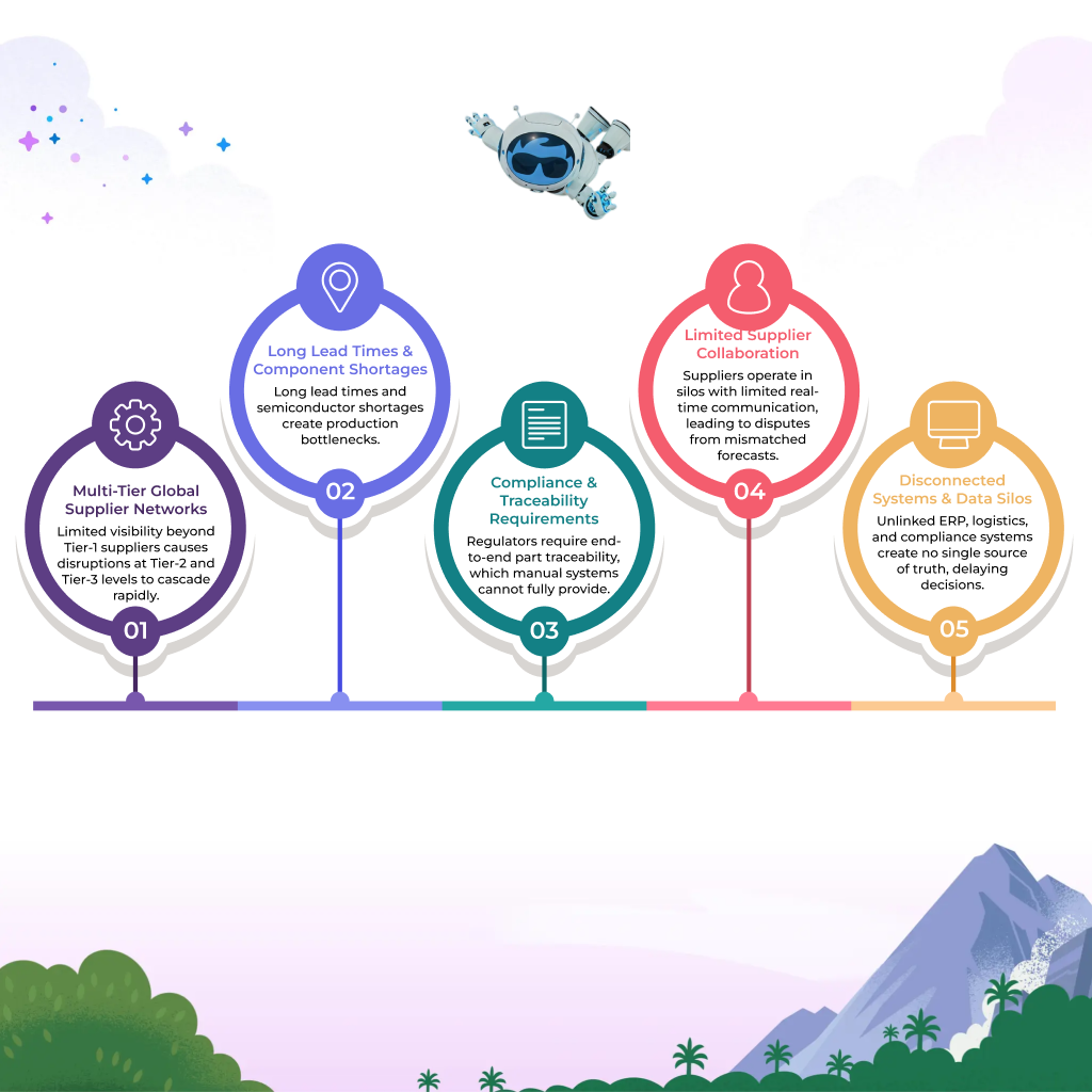 - High costs of disruption → a single supplier delay can halt production worth billions.