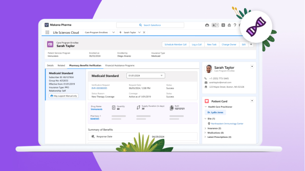 Health Cloud enables patient support programs, therapy management, and care coordination connecting patients, providers, and life sciences teams to improve adherence and outcomes.
